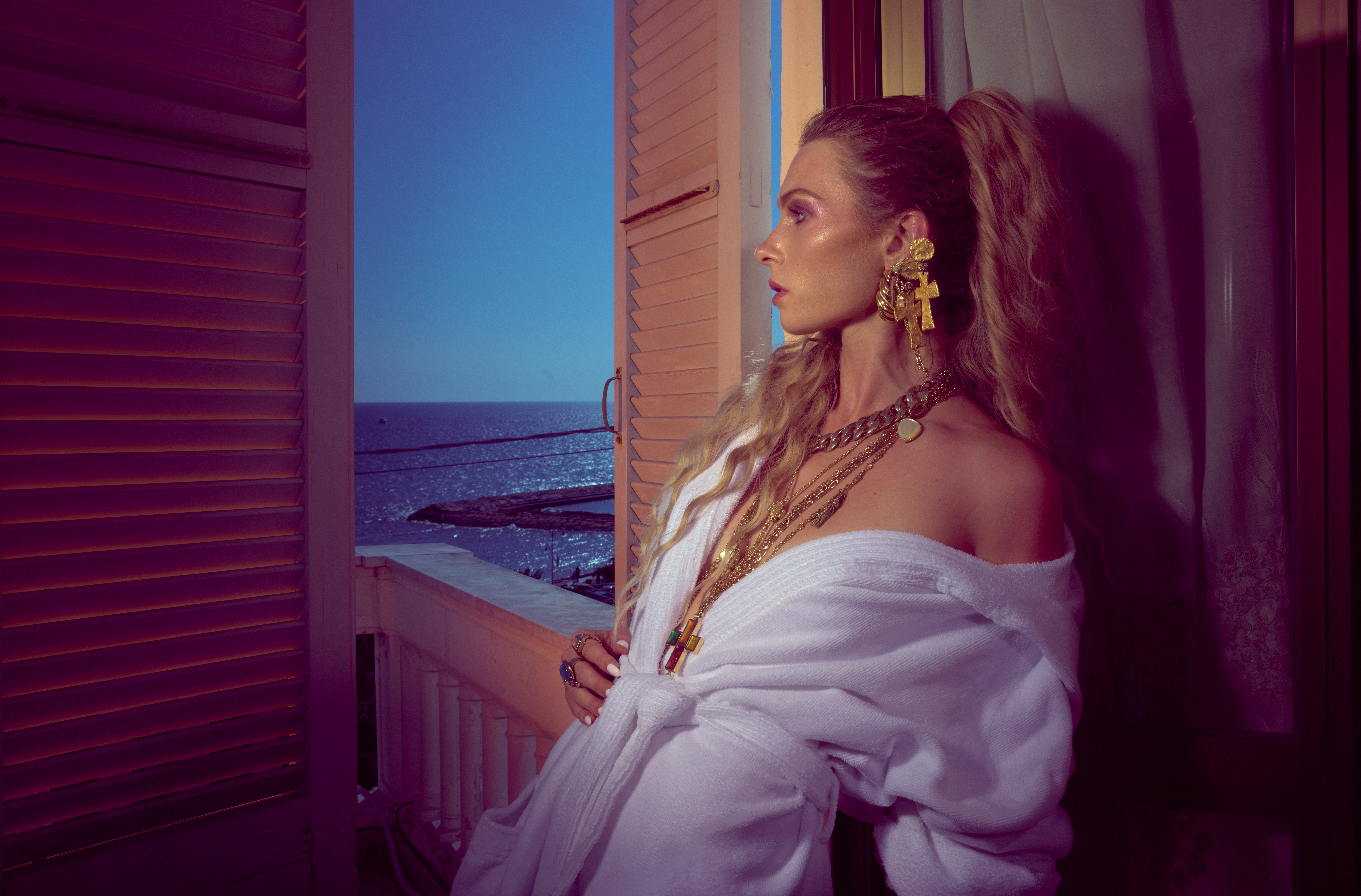 Décryptage de l’Image – Cinzia Cette image met en scène un contraste élégant et symbolique entre la douceur et la force, incarnés à la fois par la posture de la modèle et les éléments visuels de la composition.